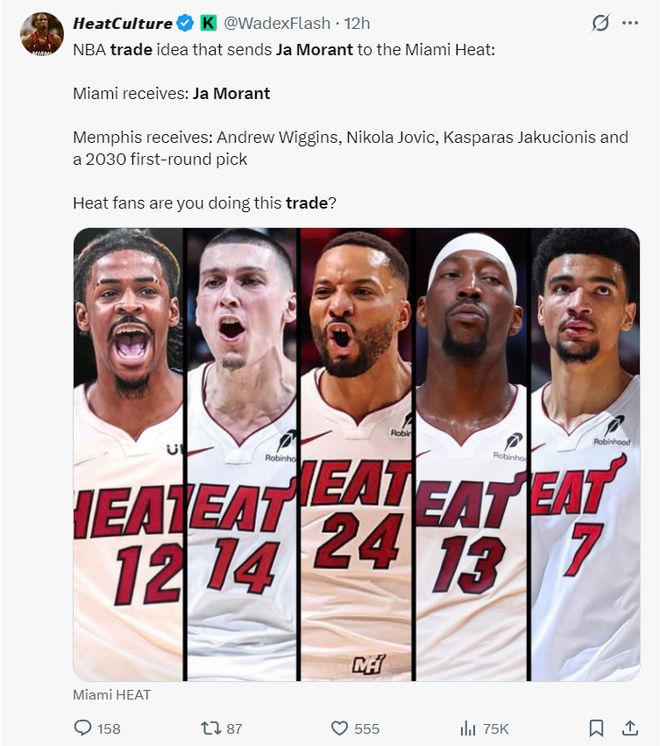 实际上热火是有能力同时得到莫兰特与小卡的,热火媒体模拟了一套交易得到莫兰特的方案,送出安德鲁-威金斯、尼古拉-约维奇、亚库契奥尼斯、2030年首轮签,也就是4换1得到莫兰特,这笔交易没动鲍威尔、罗齐尔。