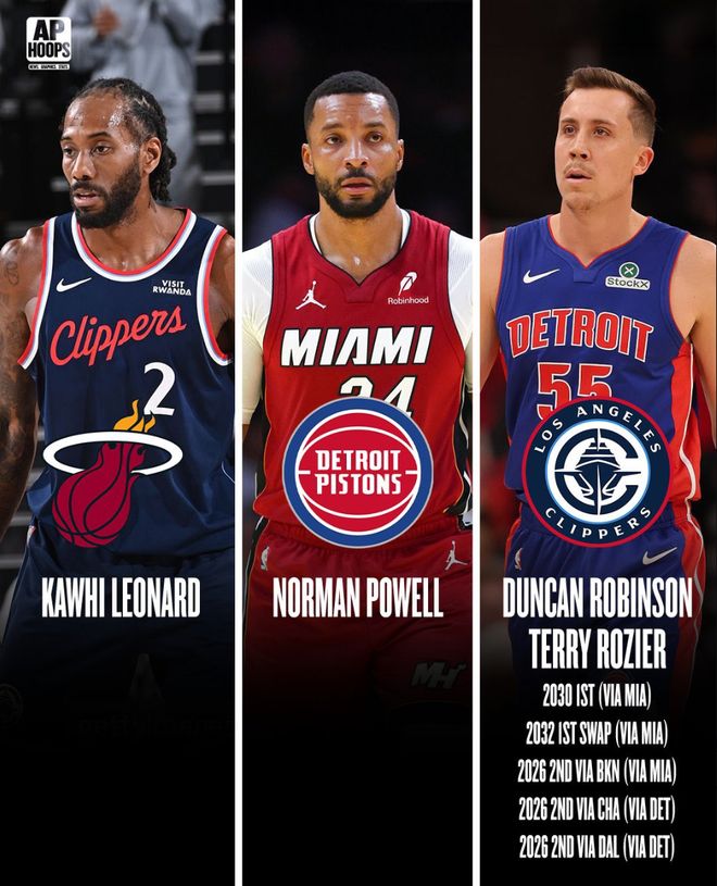 快船得到:邓肯-罗宾逊、罗齐尔、热火2030年首轮、2032年热火首轮互换权、2026年篮网次轮、2026年黄蜂次轮、2026年独行侠次轮
